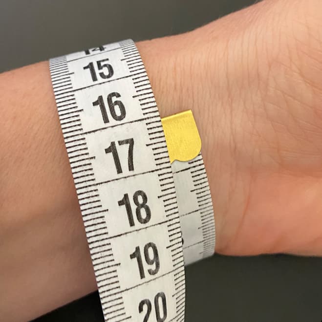 Schnapp Dir ein Maßband und leg es um die dickste Stelle am Handgelenk. Das ist normalerweise da, wo der Knochen sitzt. Es muss exakt anliegen, aber darf nicht zu eng in die Haut einschneiden. Du brauchst keine Zugabe darauf rechnen, denn ich fertige die Armbänder und Armreifen mit genügend "Luft" für einen angenehmen Tragekomfort.